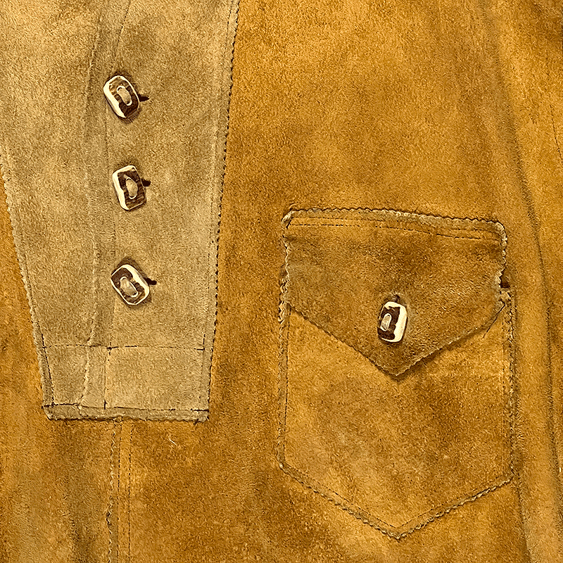 Rough-out leather flips tradition—it puts the suede side on the outside for a rugged, textured look. Cowboys, ranch hands, and rodeo riders swore by it, since it resisted scuffs and showed character better than polished hides. Leather shirts like this were popular in the mid-century, a mix between cowboy utility and Western showmanship.