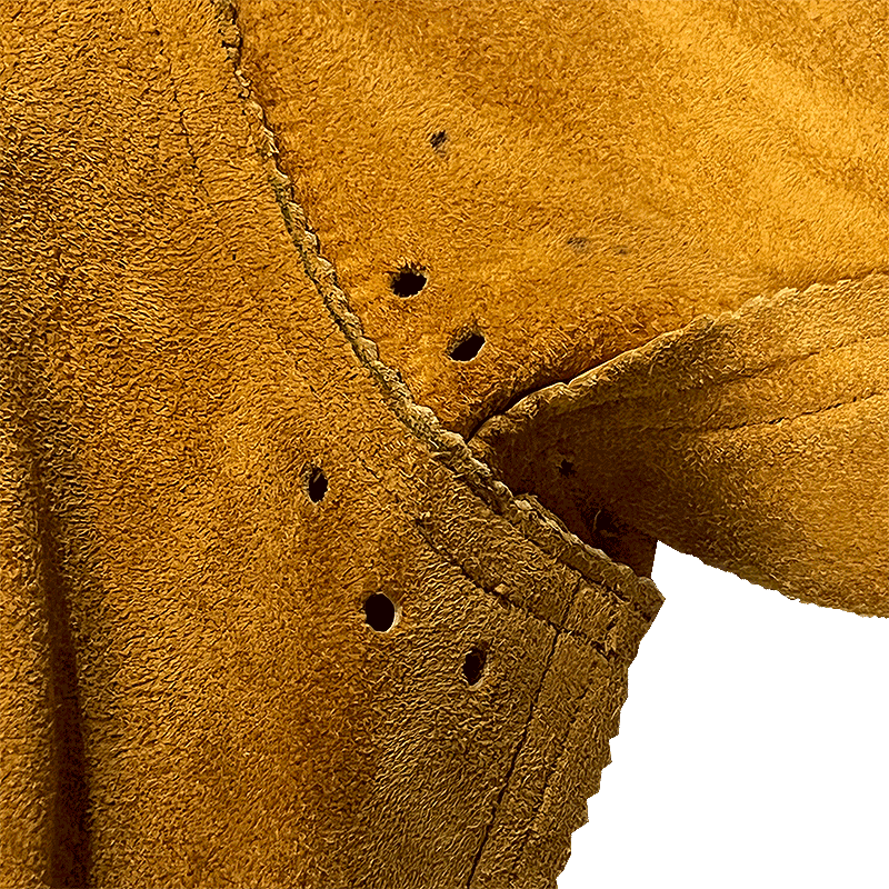 Well, partner, this here ain’t just any ol’ shirt—it’s a real-deal 1960s Canadian cowboy relic 🤠. Handcrafted from thick, heavy rough-out leather (that’s leather worn with the suede side facing out), this shirt’s got grit and grace. Despite its weight, the hide feels smooth and soft to the touch, makin’ it mighty comfortable for ridin’, ropin’, or just struttin’ proud.
