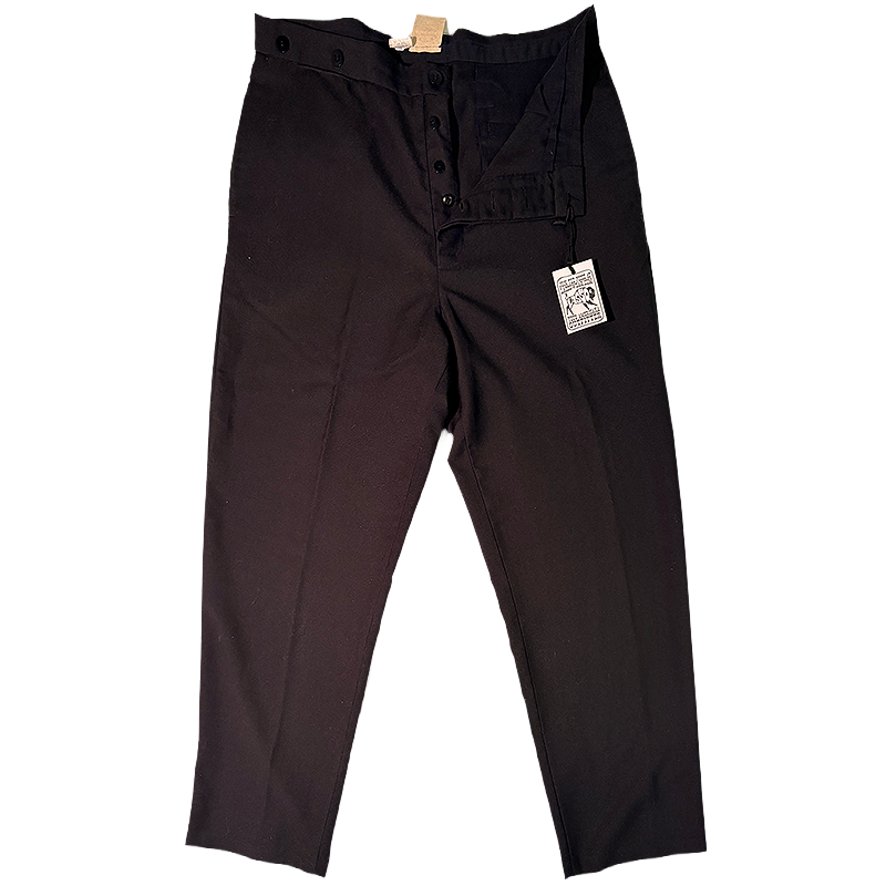They’ve got proper suspender buttons for button-on braces, not clip-ons. The rear cinch lets you fine-tune the waist the traditional way, just like frontier tailoring intended.
