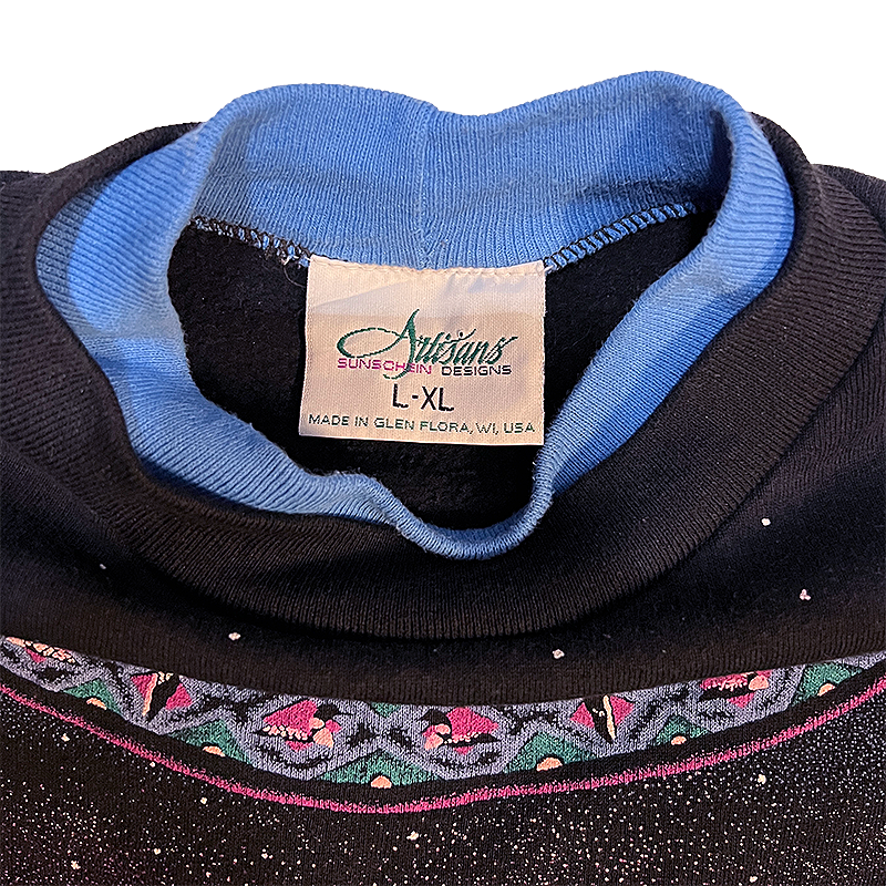 Straight outta the 1990s, this extraordinary college shirt is a real head-turner. Featuring a striking mallard print across the chest, framed by water lilies, a purple dusk sky, and geometric borders, it looks tailor-made for a hunter or anyone who loves the great outdoors. Add in that rare double collar (black outer with light blue inside), and you’ve got a piece that screams retro character.