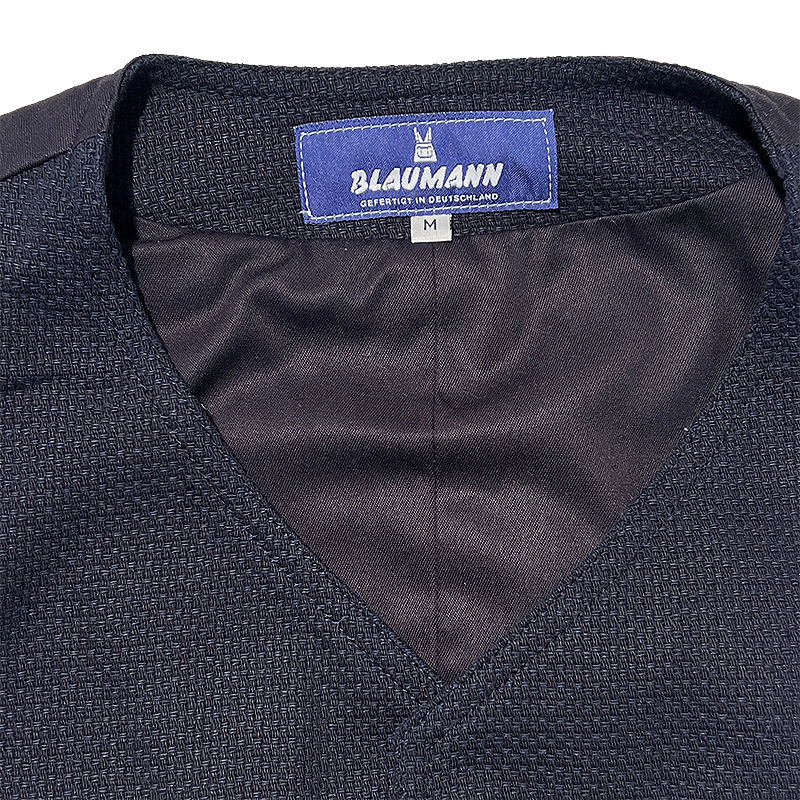 This Blaumann vest is crafted with a high-closed front in the unique Japanese Dots fabric — a textured cotton weave inspired by traditional Japanese techniques (sometimes referred to as Dobby 2 in weaving terms). The indigo-dyed front panel contrasts beautifully with classic dark blue tones, giving the vest depth and subtle patterning without loud branding.