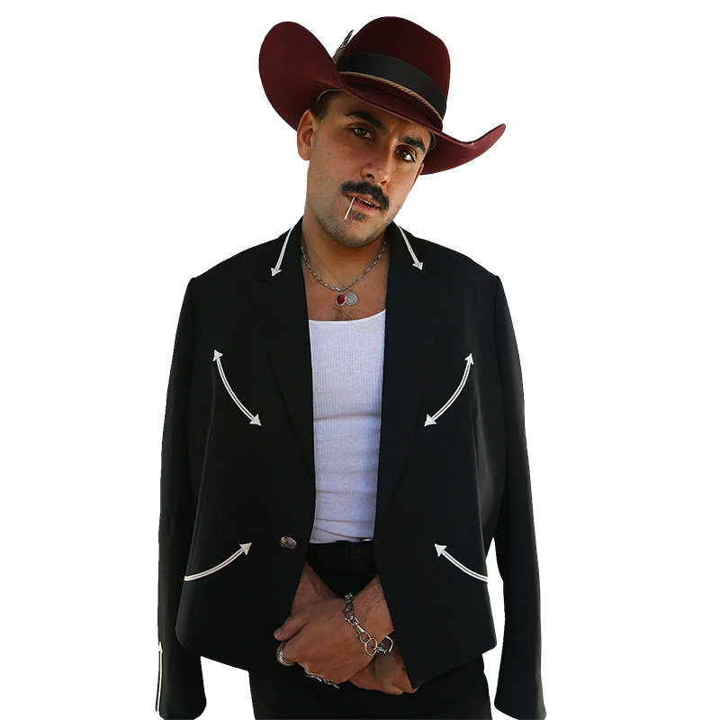 Cut in a sleek silhouette, the jacket channels tuxedo structure through a ranchwear lens. Four signature “smile” pockets curve across the front while bold arrow accents on the sleeves and collar bring clean western character. The result works effortlessly for formal settings, semi-formal occasions, or elevated casual looks where precision still counts.