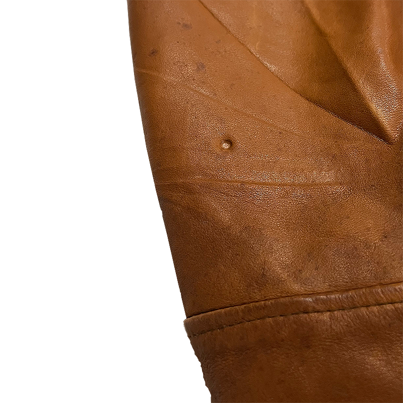 Condition: Vintage wear throughout with stains, marks, and a small sleeve dent – all adding rugged character
