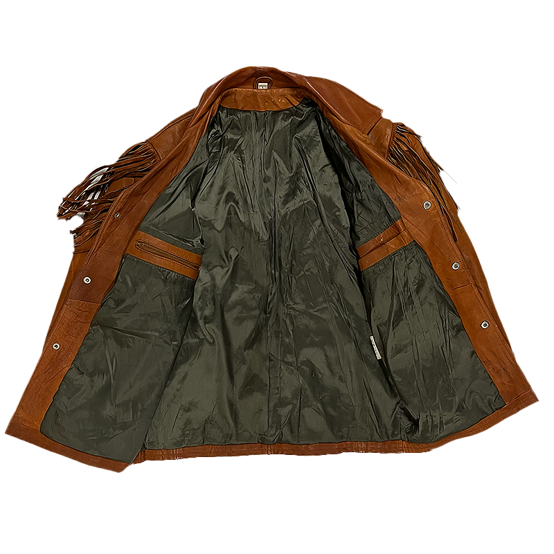 Though unbranded, this beauty carries the hallmarks of French craftsmanship – supple hides, sharp tailoring, and a design that marries rugged Western grit with continental flair. In the 60s and 70s, French makers often reimagined American cowboy culture for the European market, creating statement jackets full of fringe and rebellion. This one walks that line perfectly: frontier toughness with a touch of Parisian edge.