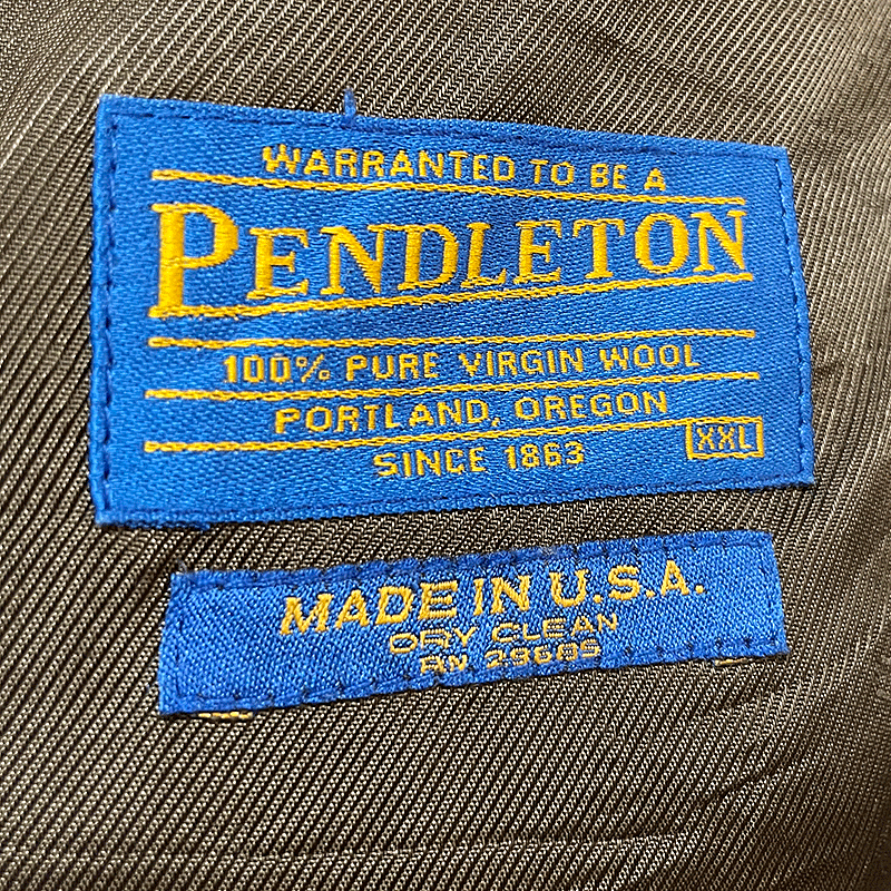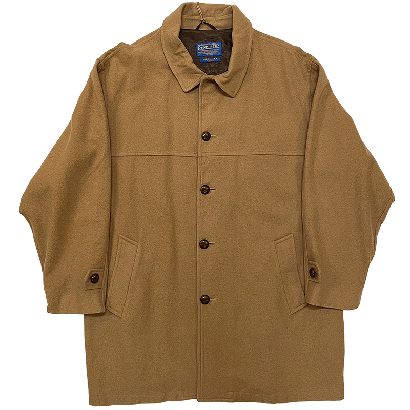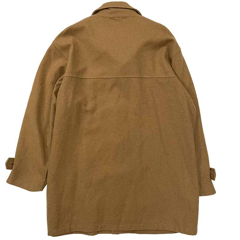 Here’s a downright dashing wool coat in a sharp tan shade, proudly made in the USA. Based on its style & some details, we’d peg it as a fine creation from somewhere between 1994 and 2009—back when quality like this was still the gold standard. It’s got handsome brown leather buttons that add a touch of rugged charm to its clean-cut look.