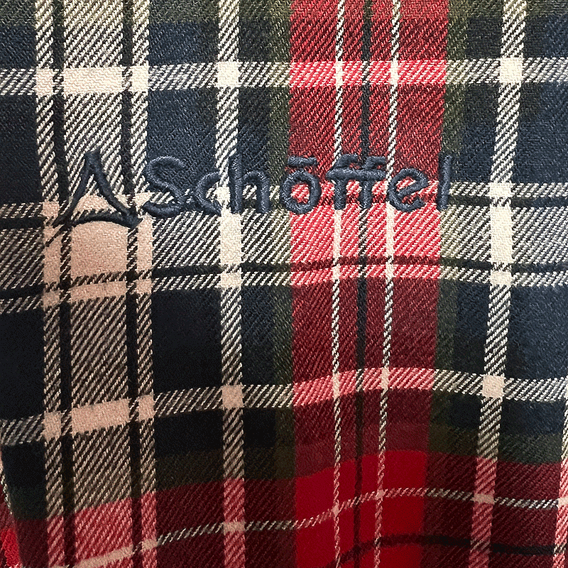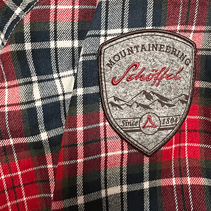 The plaid is bold and classic, paired with western shoulder yokes that nod to cowboy tradition. Instead of snaps, you’ll find regular buttons for a sturdier outdoor feel. On the sleeves, Schöffel leaves its mark — embroidered branding on the right and a mountaineering patch on the left, proudly carrying the brand’s long history.