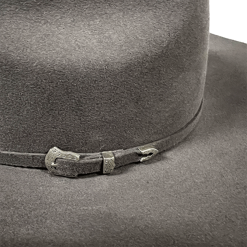 Built with a Cheyenne crown and wrapped in a self-felt band, the look is clean, classic, and topped off with a silver buckle set that whispers cowboy class. And let’s talk brim – this beauty sports a raw edge 4-inch brim (that’s a bold 10 cm) that’s as practical as it is handsome. It'll keep the sun off your face and the rain off your back, no map required.
