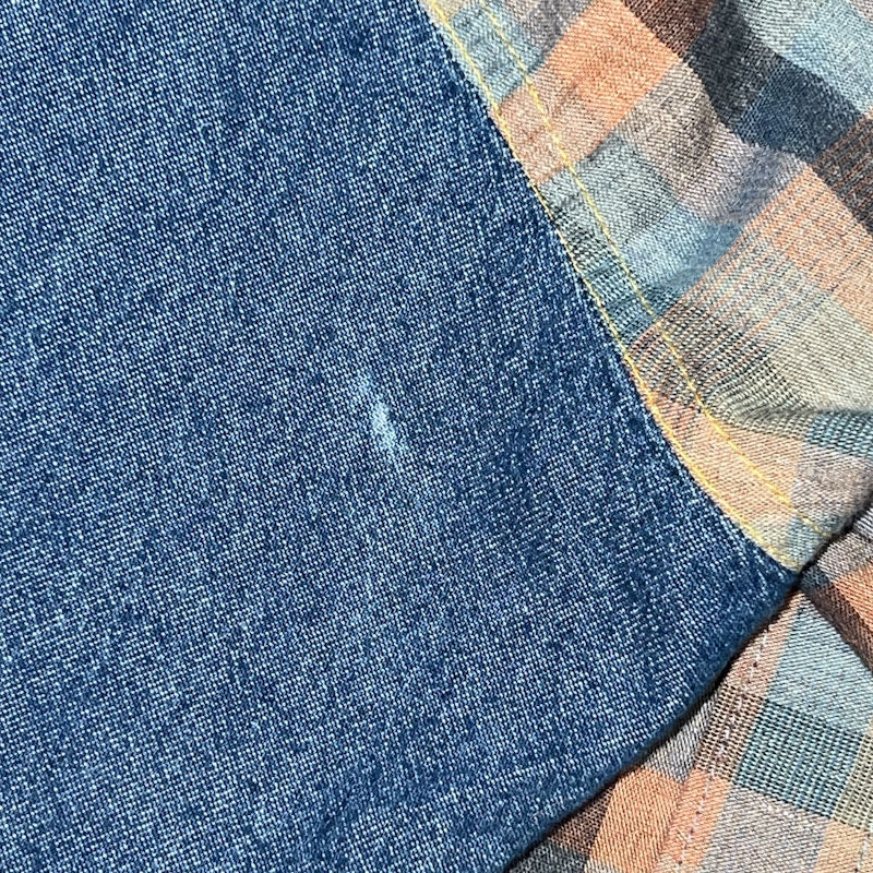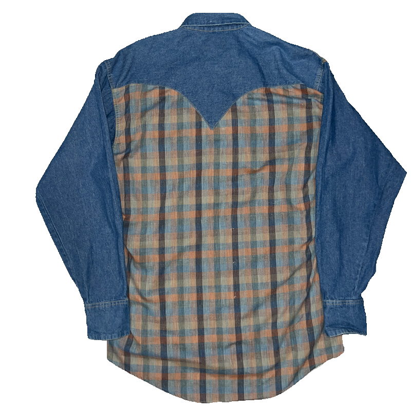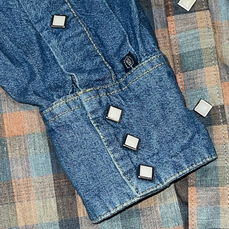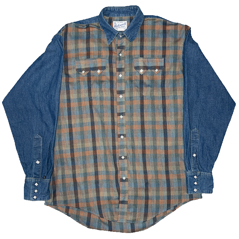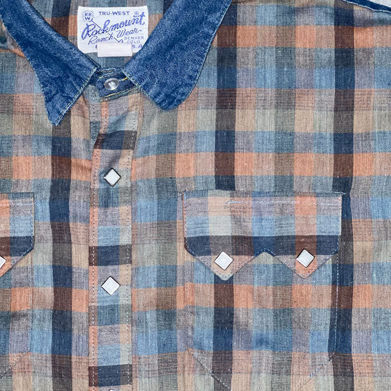 It’s got a unique twist with denim sleeves paired up with a blue, gray, and orange plaid torso—talk about a head-turner! And don’t forget those signature Rockmount touches: sawtooth pockets and square pearl snaps.